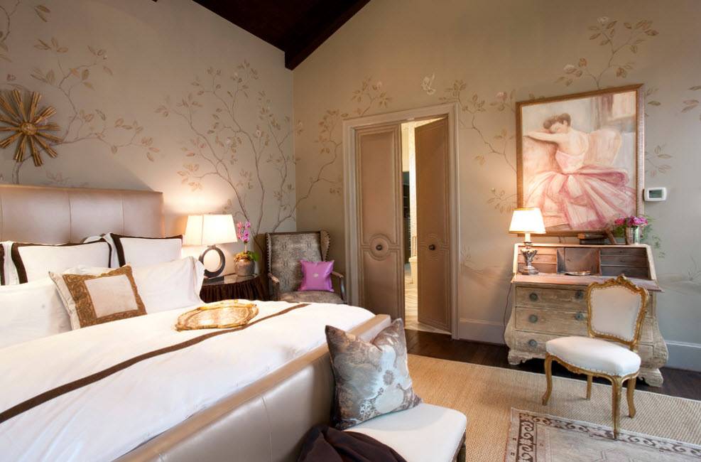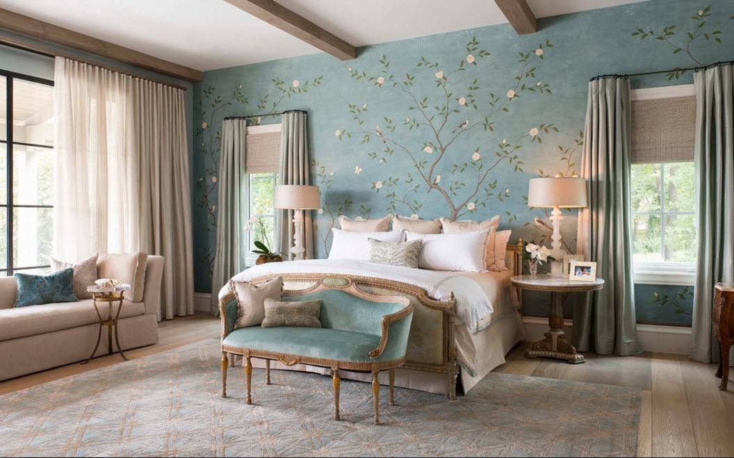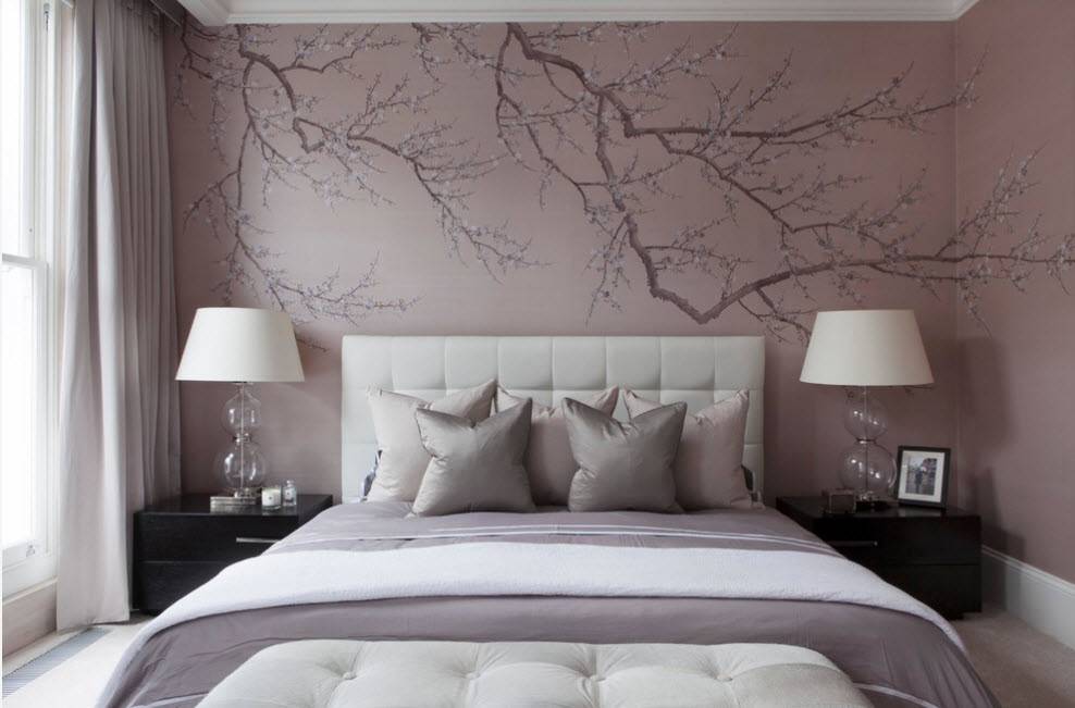 Чаще всего для спален выбирается романтический стиль рисунка на стенах. Большинство из нас стараются создать в комнате максимально расслабляющую атмосферу для сна и отдыха. Поэтому нежные оттенки в изображении цветочных мотивов или светлых пейзажей становятся центральной темой в интерьере спальни.