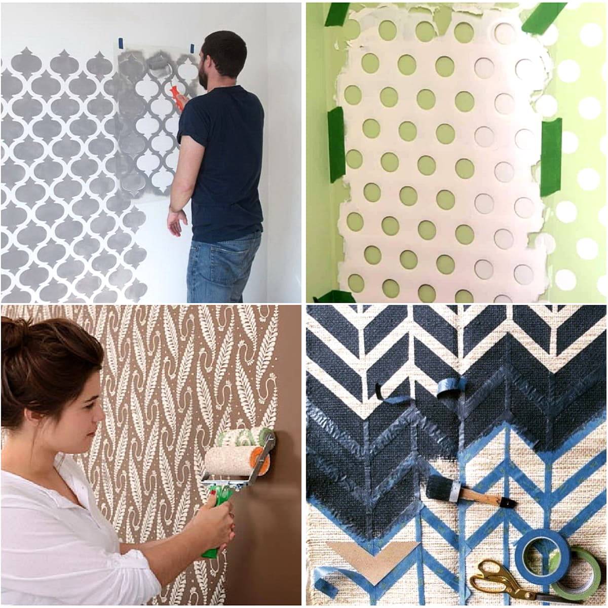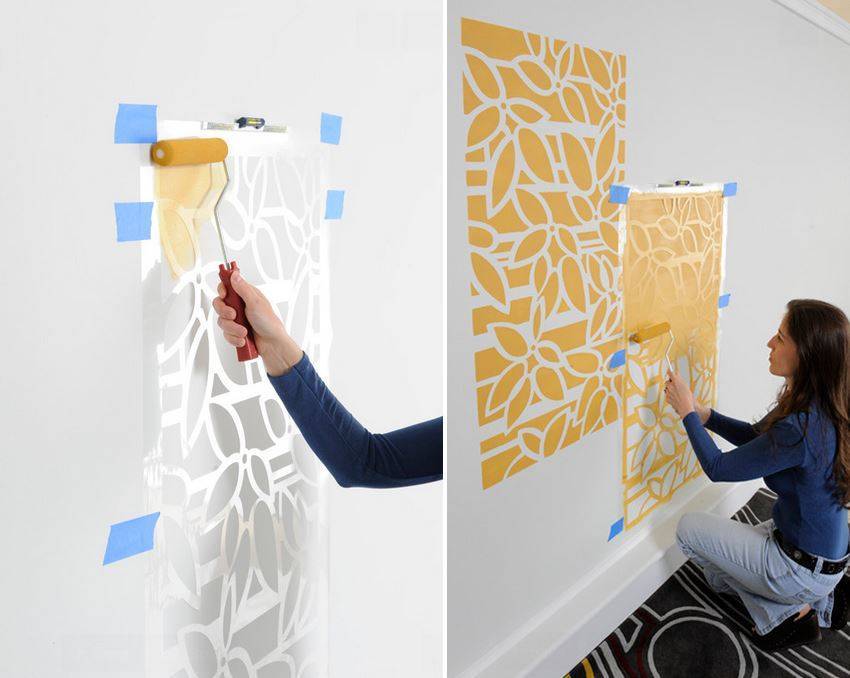 На стену узор можно наносить при помощи трафарета. Подобная техника предоставляет широкий простор для фантазии, дает возможность играть на контрасте цветов. Этот тип украшения стен подходит для мелкого формата и монохромного рисунка. Трафарет можно купить либо самостоятельно подготовить контур на принтере, который потом переводится на плотный картон.