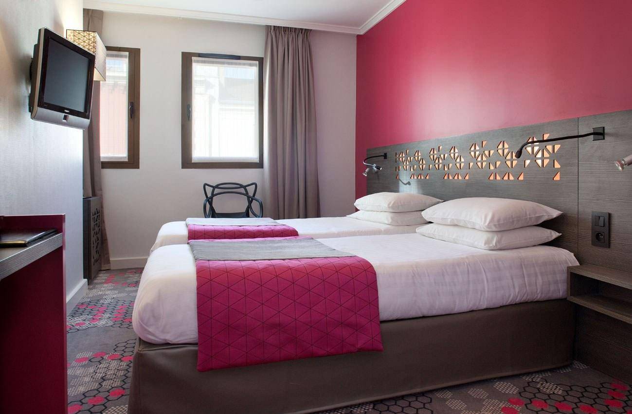 На фото серые обои с геометрическим принтов в сочетании с розовым текстилем в интерьере небольшой спальни.