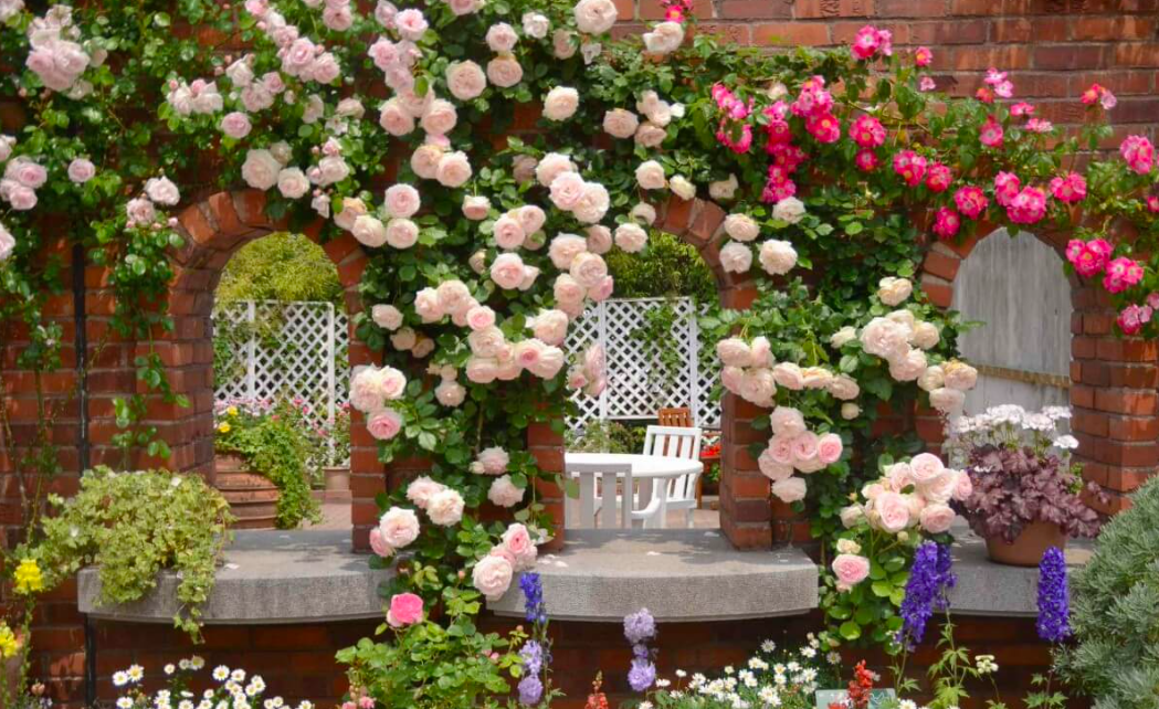 Самые популярные соседи плетистых роз при создании ландшафтных композиций – клематисы. Клематисы растут в виде лиан и, как и плетистые розы, нуждаются в дополнительной опоре. Лучше всего сочетать плетистые розы с крупными поздноцветущими сортами клематиса. Растения обладают широкой цветовой гаммой, поэтому можно придумать множество решений для ландшафтного дизайна – от обыгрывания схожих оттенков до контрастных сочетаний.