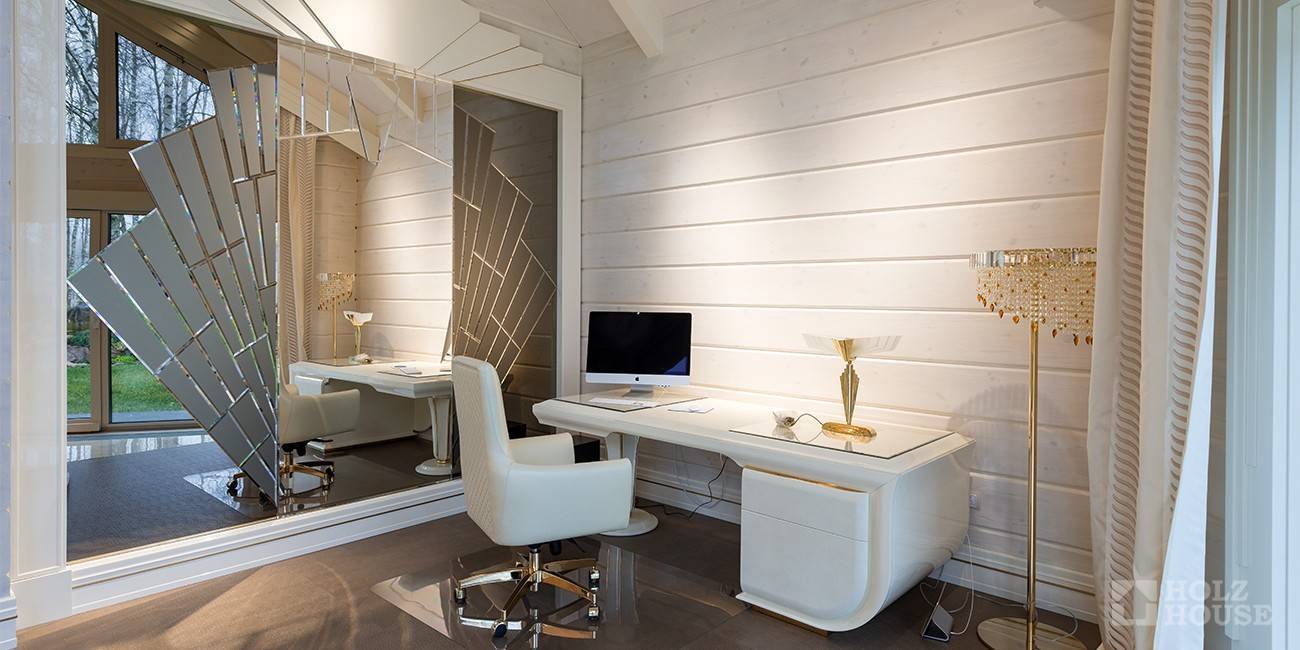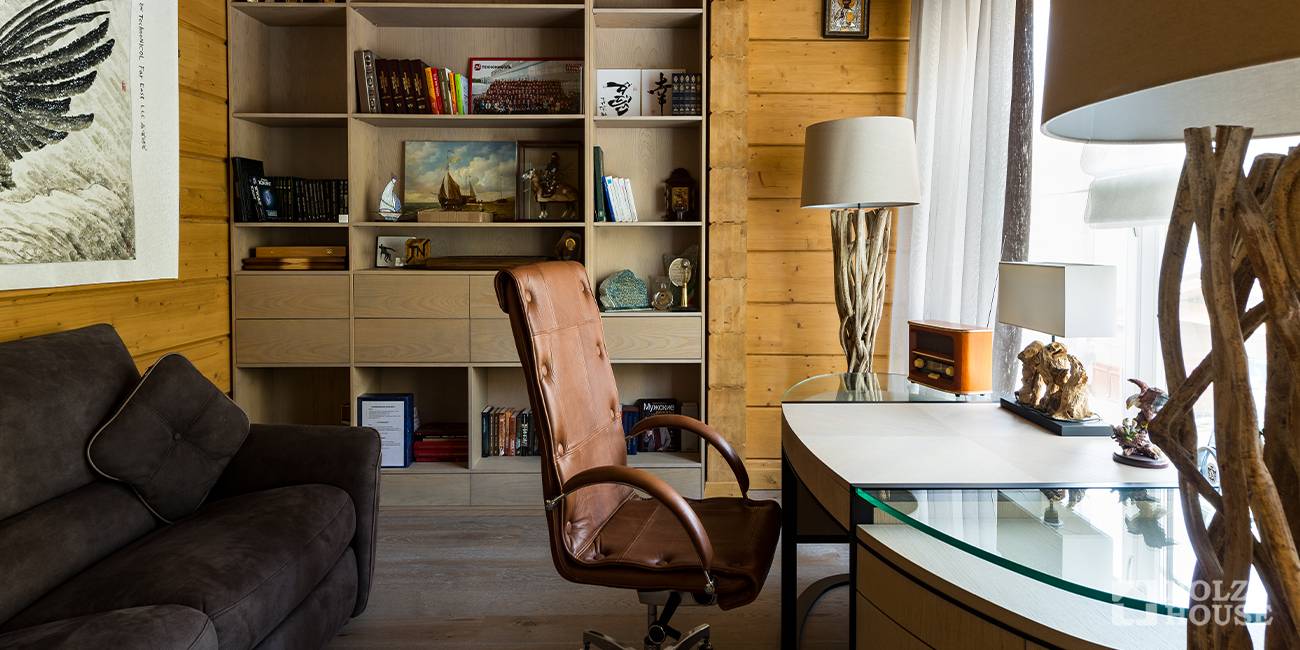 Кабинет в доме, построенном из клееного бруса, будет смотреться солидно и элегантно, если интерьер полностью выполнить из натуральных материалов высокого качества. Деревянный письменный стол лучше разместить возле окна, обустроить библиотеку, которая особенно эффектно будет смотреться на фоне деревянных стен. Освещение – важный элемент рабочей зоны, поэтому источников света должно быть несколько. Для отдыха и чтения можно поставить диван или пару кресел. В зависимости от выбранного стилистического направления, кабинет оформляется элементами декора в соответствующей тематике: картины, предметы старины, аквариум и так далее.