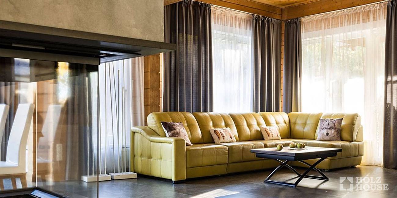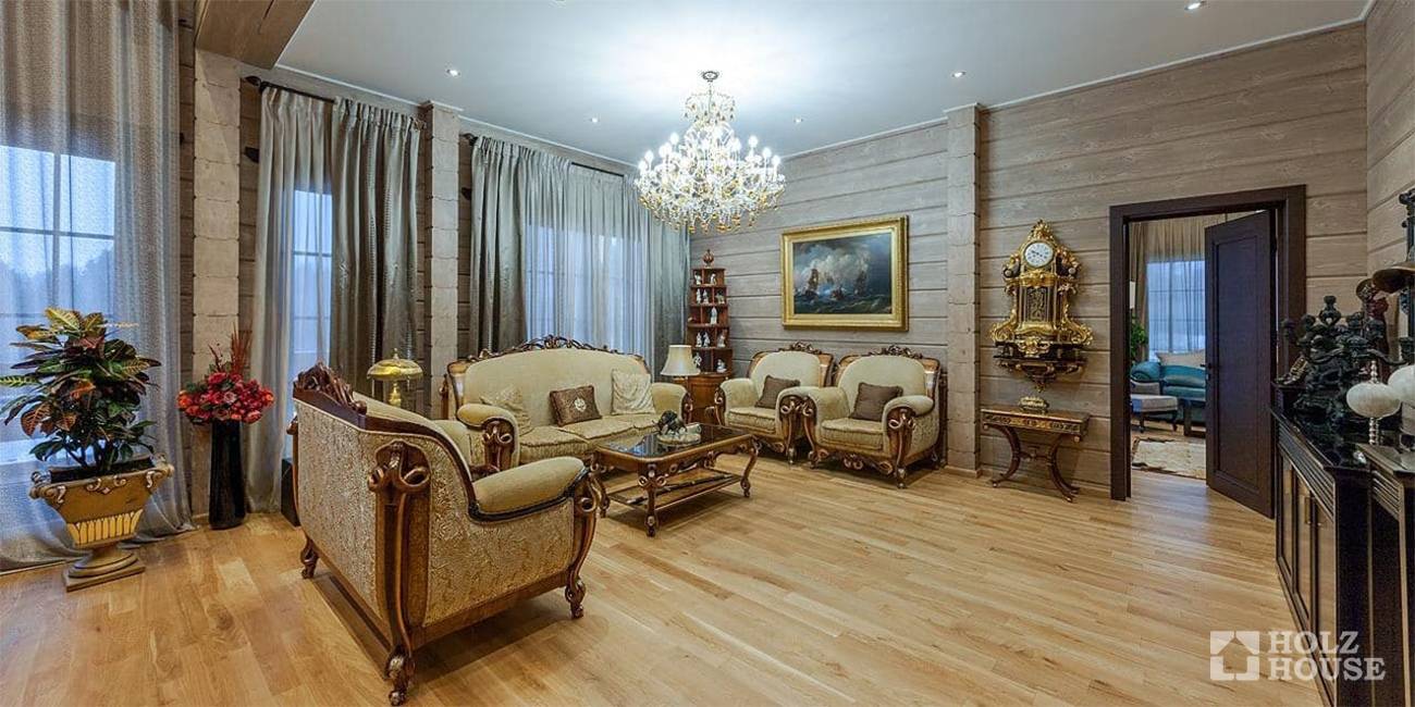 Светлая гостиная частного дома из дерева