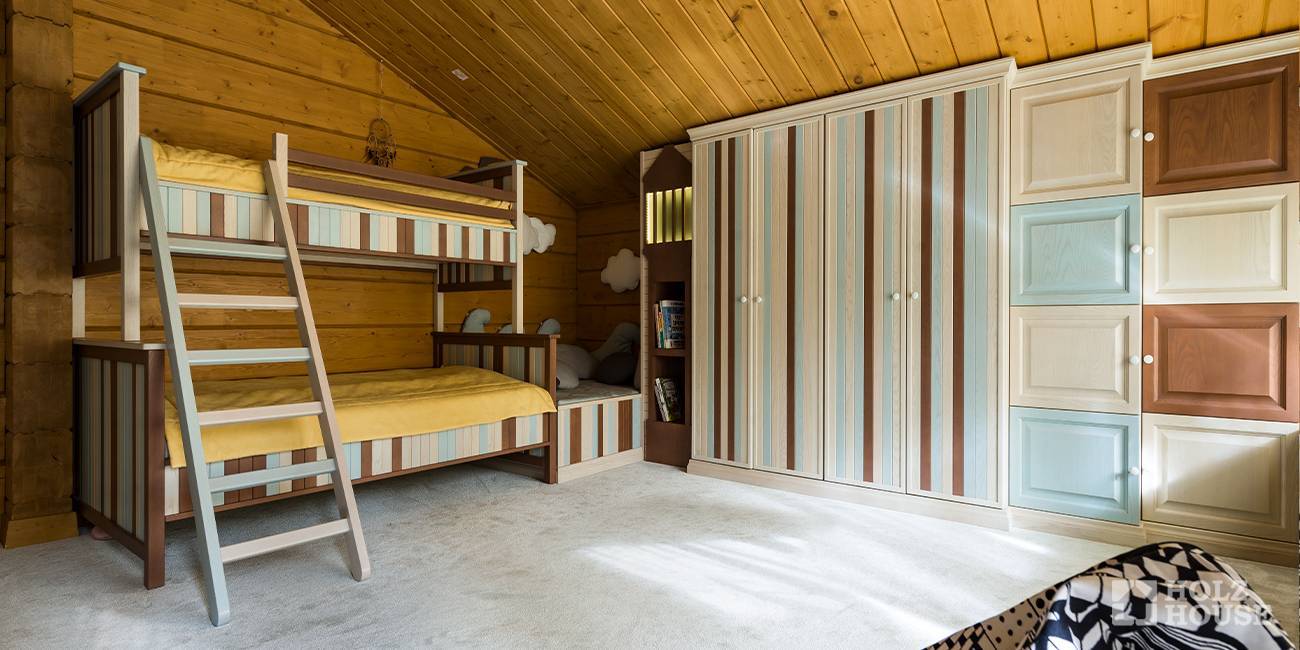 Клееный брус как экологически чистый материал, не вызывающий аллергических реакций и способствующий нужному микроклимату, идеально подходит для обустройства детской комнаты. Необычно и уютно будет выглядеть детская комната в мансардном этаже со скошенным потолком. Мебель можно также сделать из дерева, а сам интерьер разнообразить ярким текстилем и предметами декора.
