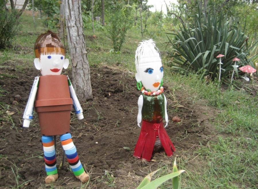 - Из подручных средств. Даже ненужный мусор (старые тазики, цветочные горшки, шины и пластиковые бутылки) можно использовать в качестве материала для изготовления садовых фигур. Забавная фигурка может получиться, если нарисовать тело гнома на большой бочке и сверху добавить автомобильную шину в виде головы.