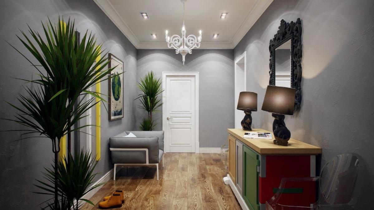 Дополнение интерьера яркими аксессуарами, синего или зеленого цвета, только усилит эффект. Увеличить пространство, добавить элегантность, когда коридор в серых тонах, позволят жемчужные или алюминиевые оттенки.