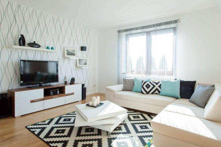- Гостиная. В небольших по площади помещениях для оклеивания стен выбирают обои светлых холодноватых тонов. Лучше, если на них будет неброский геометрический рисунок. Одну стену можно оформить обоями-компаньонами более темного цвета. Массивную мебель – диван, шкафы – выбирают на несколько оттенков светлее, почти белую. Для контраста в комнате расставляет два или три темно-серых предмета – журнальный столик, телевизор, кресло. На пол можно положить ковер с коричневатым оттенком. Если комната покажется слишком скучной, дополните интерьер диванными подушками на несколько тонов темнее, чем ковер, или в цвет кресла. Для больших гостиных подойдет более темная мебель, фотообои в стиле ретро или газетный принт на одной из стен.