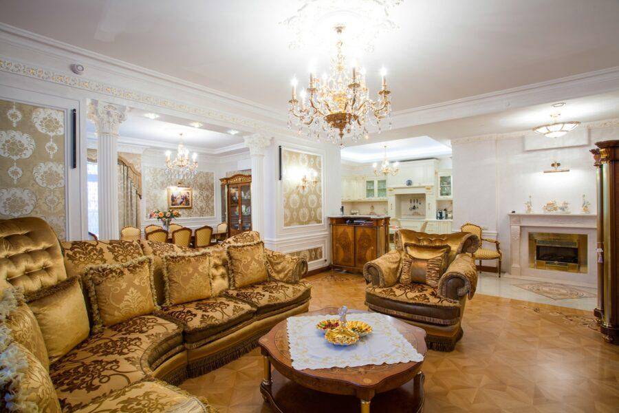 - Золотистые вензеля и богатые орнаменты принадлежат более помпезным и величественным стилям ампир, рококо и барокко;