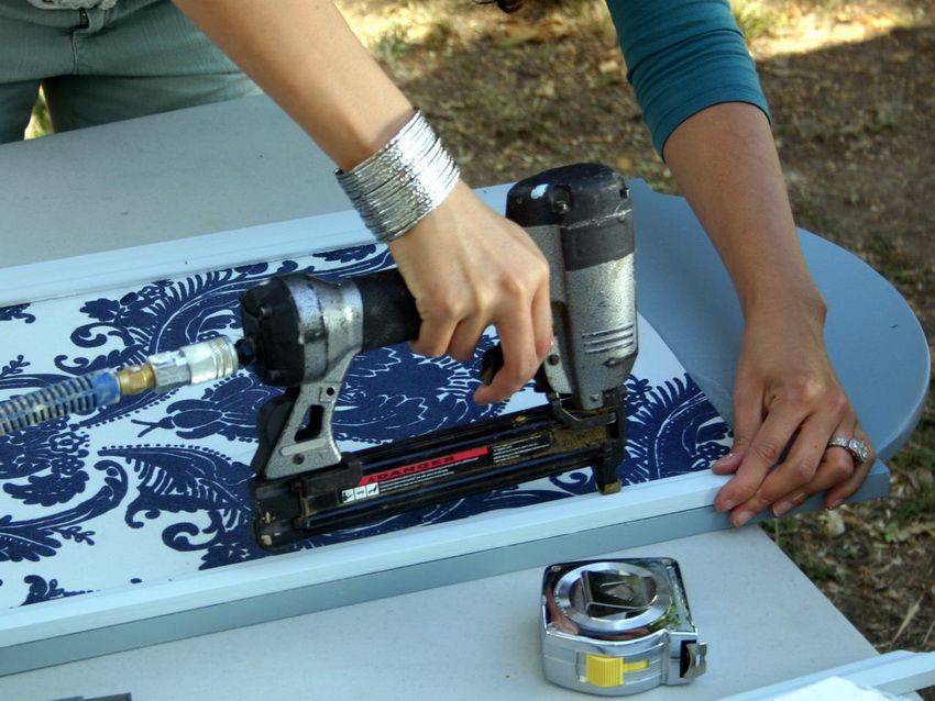 - С помощью клея закрепите по краям обивочную ленту. Дополнительно зафиксируйте ее гвоздями. Повторите аналогичные действия на всех панелях.