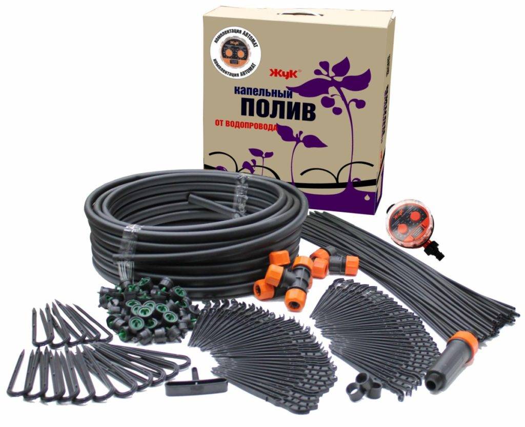 Конструкция «Жук» простейшая и также направлена на самостоятельный сбор и установку на участке. В шланге есть несколько разветвлений для капельниц. Это делает орошение грядок быстрым, по при этом качественным. Единственный минус — система не имеет таймера времени. Его придется приобретать дополнительно. Подключается система к водопроводу или устанавливается в бочку. Плюс системы «Жук» — относительная дешевизна и простота в установке.
