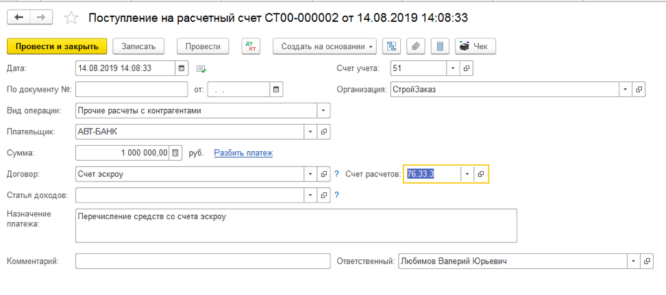 Остаток средств со счета-эскроу поступил на расчетный счет Дт. 51 Кт. 76.33.3 (76.33.4) «Расчеты с дольщиками (инвесторами) по средствам на финансирование строительства».