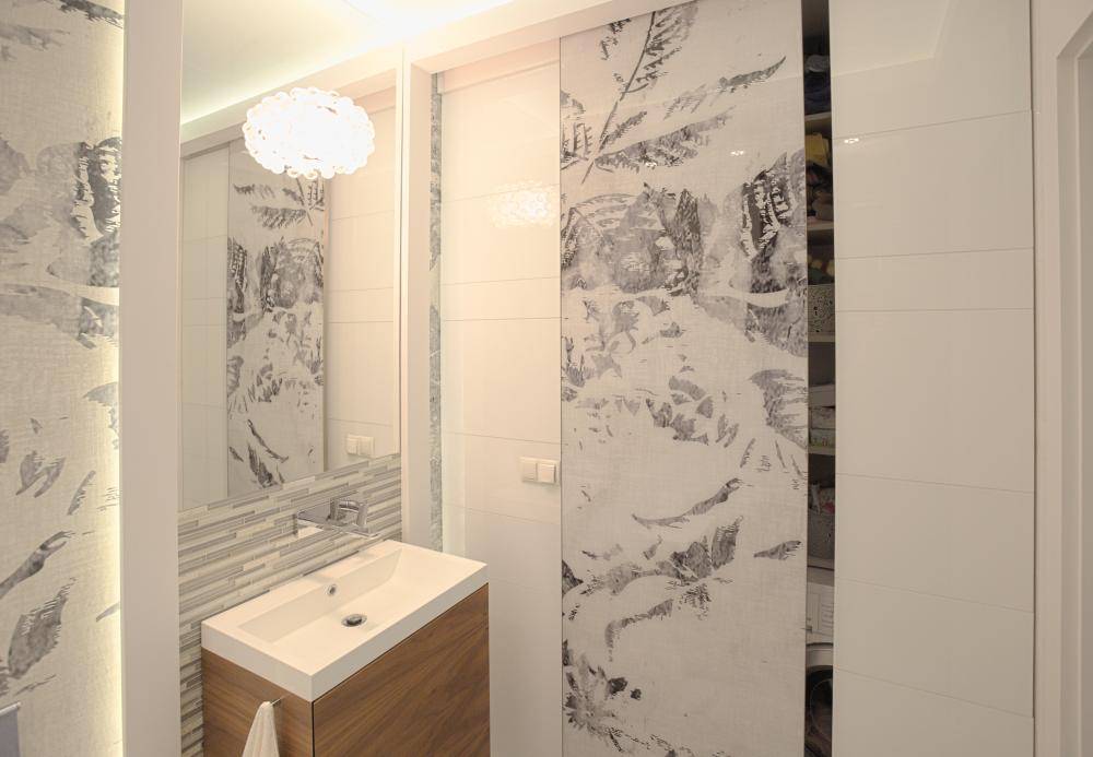 Также традиционное зеркало над умывальником может стать дополнительным местом хранения. Если разместить его на створке плоского шкафчика. Причем створка может быть не распашной. А, например, купейной или откидной.