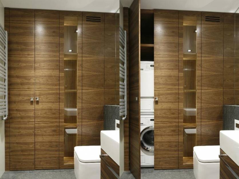 Если площадь ванной позволяет, вы можете расположить стиральную машину в шкафу. Оставшееся пространство можно использовать для вставки сушилки или установки чистящих средств. Мебель, используемая для стиральной машины, является интересным вариантом маскировки этого устройства. Все закрыто и полностью нейтрально для оформления комнаты.