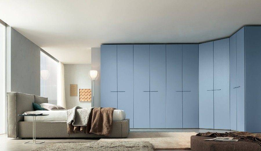 Традиционно в угловых шкафах применяют распашные дверцы, которые легко крепятся на обычных петлях. Недостаток проявляется в условиях дефицита полезной площади спальни. Если кровать стоит близко от шкафа, то открытые двери могут в неё упереться и не открыться полностью.