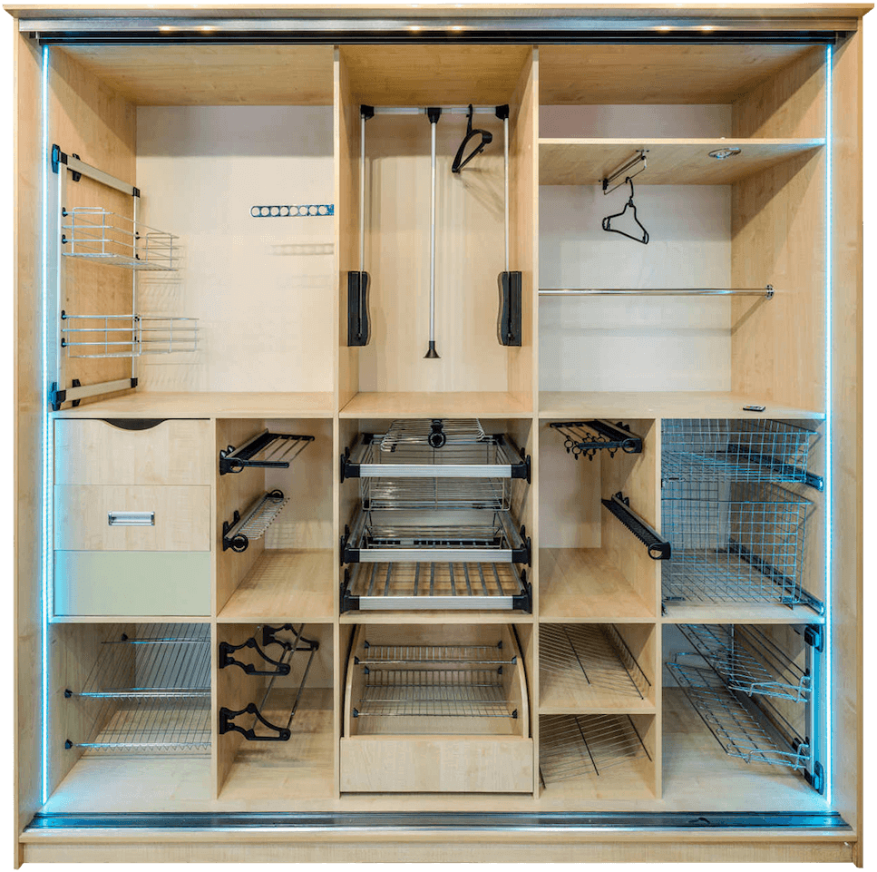 необходимо обращать внимание на качество материала изготовления шкафа, его фасадов, дверей, крепежей и фурнитуры. Элементы внутреннего наполнения также должны быть выполнены из прочных материалов: штанга, крючки и вешалки из металла, полки из дерева;