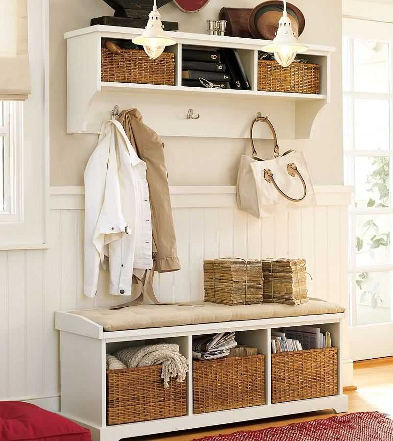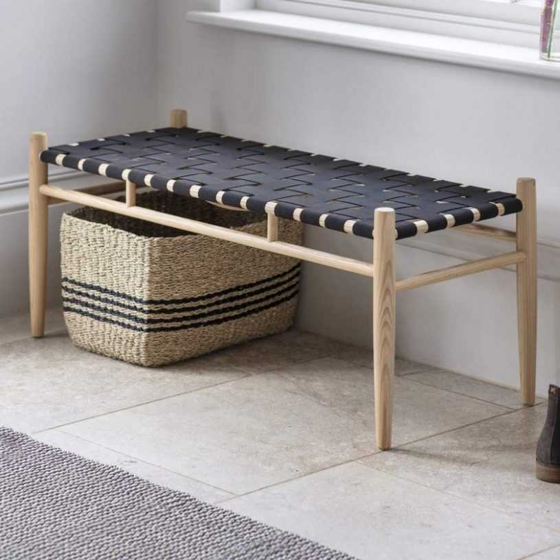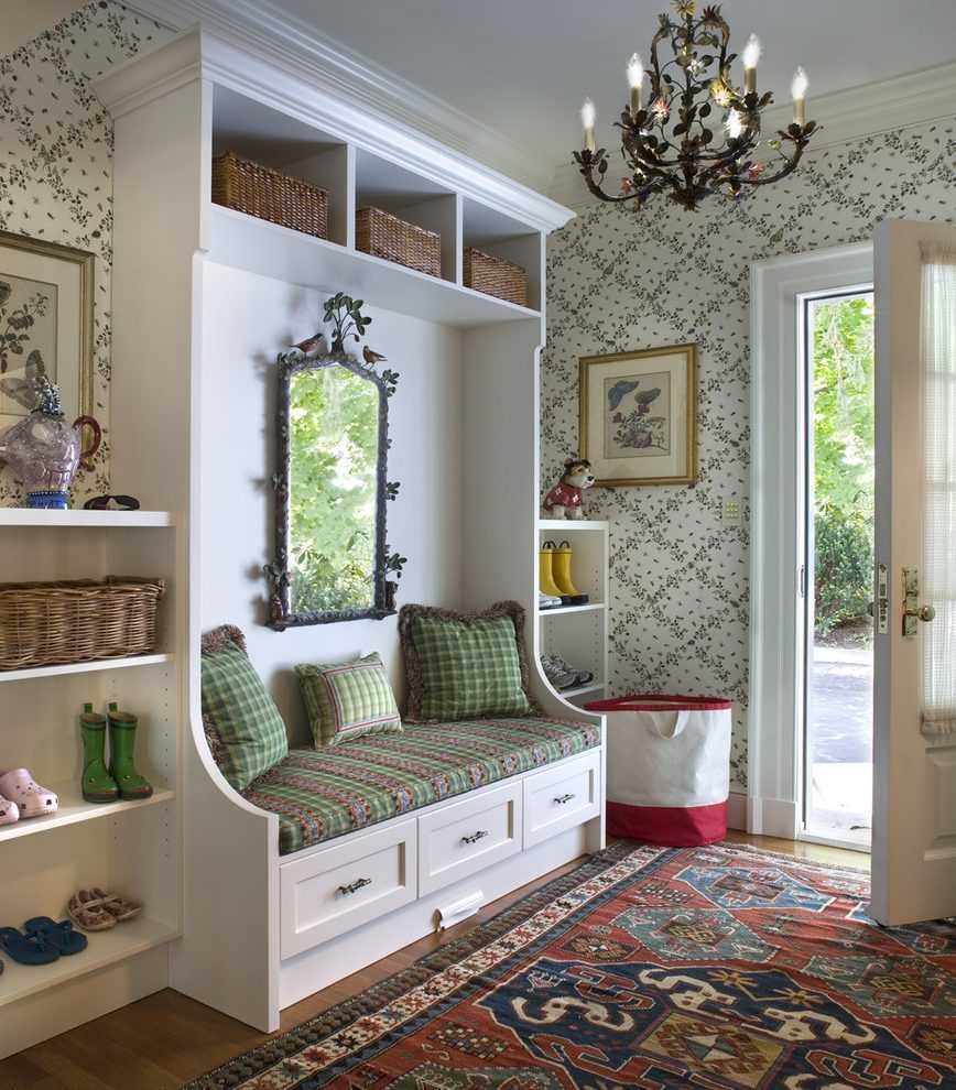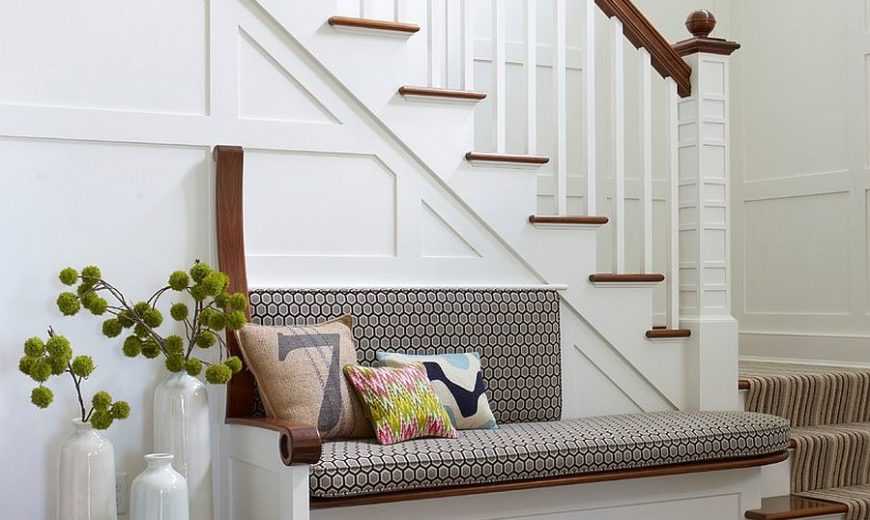Оптимальная обивка для мягкого сиденья — кожаная или выполненная из заменителя кожи. В прихожей бывает и грязно, и мокро, поэтому возможность производить чистку очень важна. Но если вы решили остановиться на ткани — выбирайте немаркие образцы.