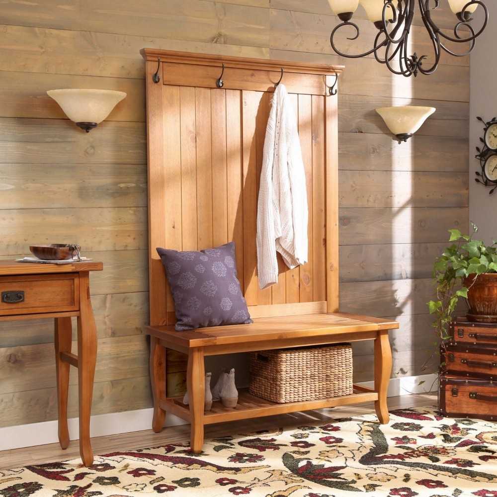 - Скамья в деревенском стиле представляет собой обычную лавку без излишеств. Галошница является обувной тумбой, с возможностью сидеть на ней. Модели бывают горизонтальными и вертикальными. Выполняются из натурального дерева, ДВП, ДСП, пластика.