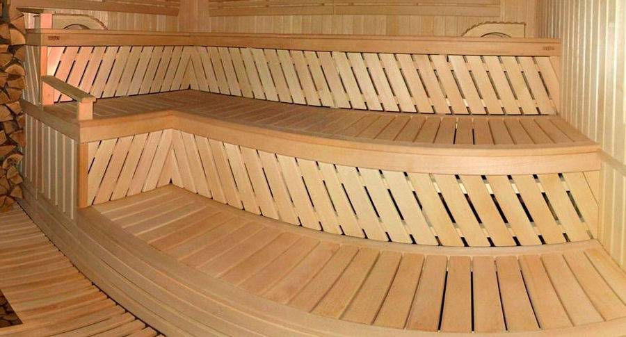 - Скамьи в парной мастерят из липы, дуба, лиственницы. Это лиственные деревья, не выделяющие смолу и не обжигающие кожу, обладающие лечебными свойствами. В парной не устанавливают мебель из сосны из-за появления смолы на поверхности.