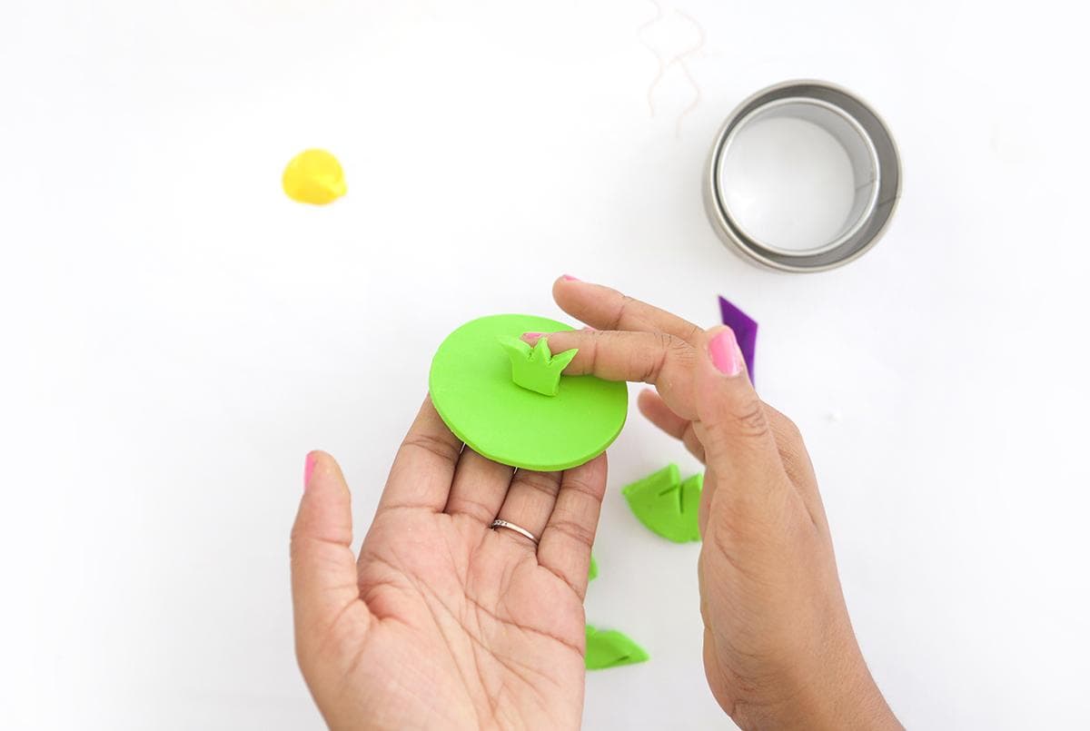 Выдавливаем кружочки из полимерной глины зеленого цвета. Запекаем их и склеиваем между собой.