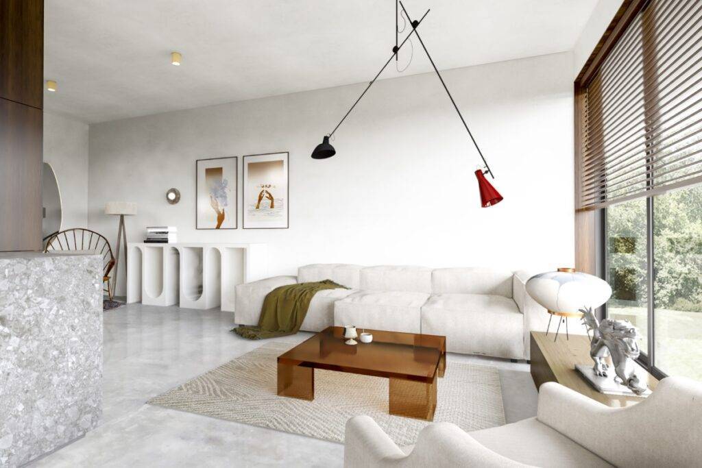Одна из хитростей, позволяющая создать современный дизайн гостиной 2022 года, — использование раздвижных и сплошных стеклянных перегородок.