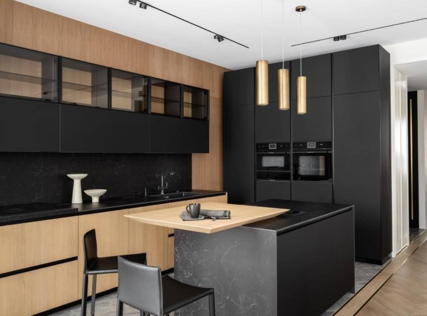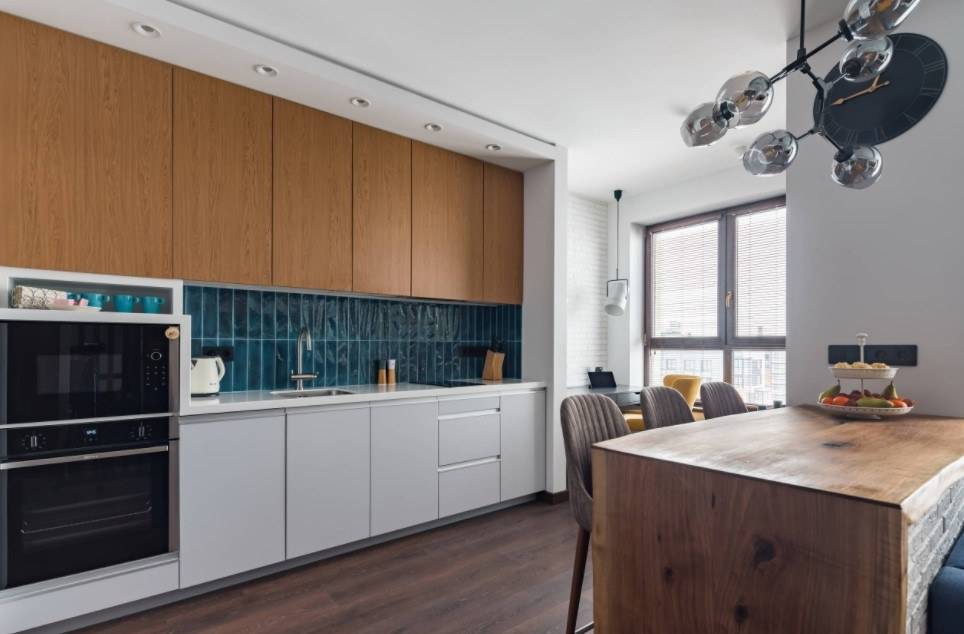 Основные черты современной кухни, независимо от выбранного стиля: наличие широких рабочих поверхностей, четкие линии.