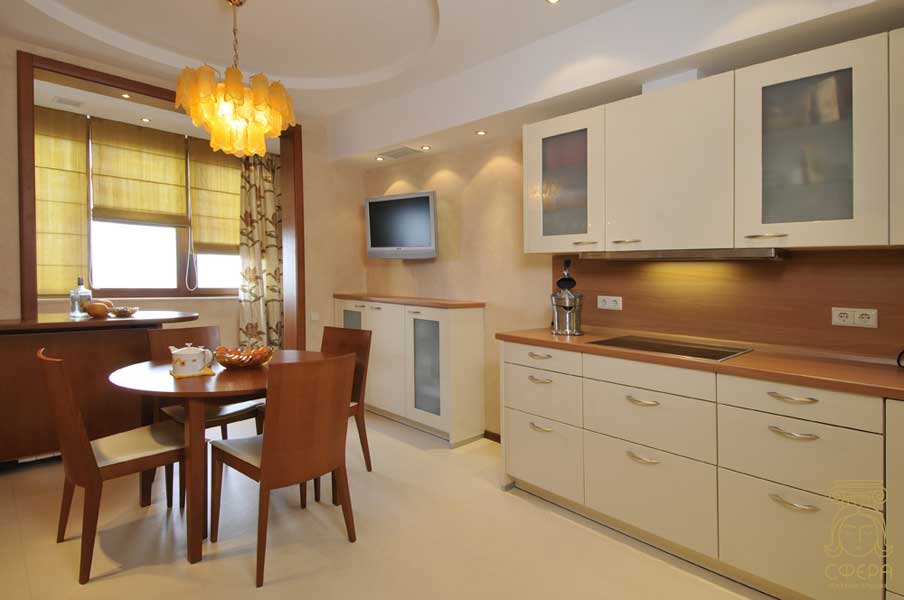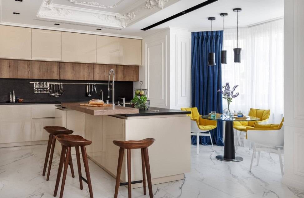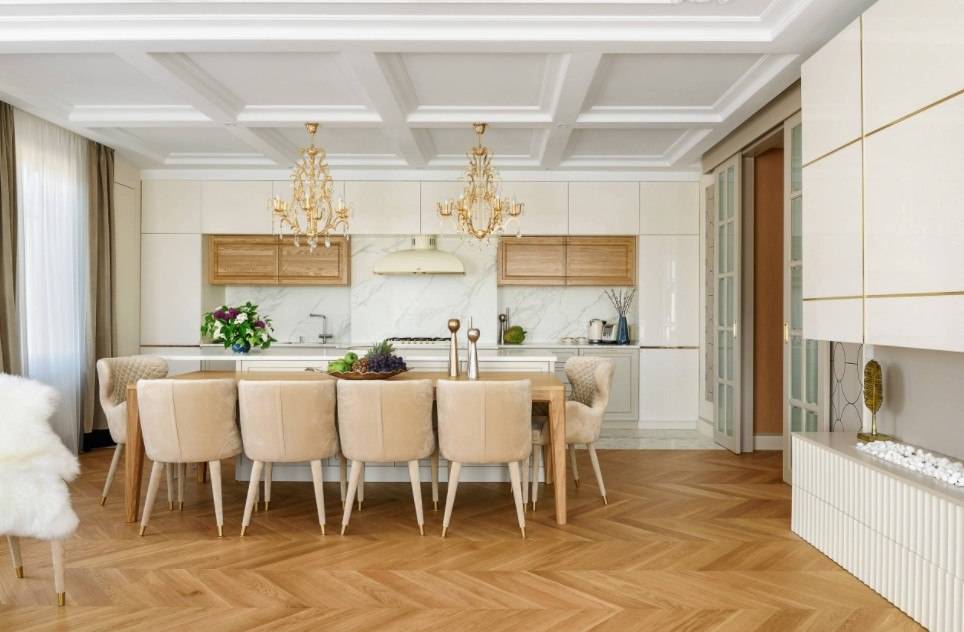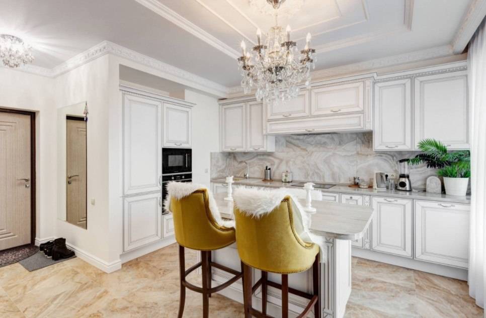 Если дополнить дизайн гармоничной лепниной на потолке и гардинами теплых цветов, то получится удобная кухня с классической стилистикой.