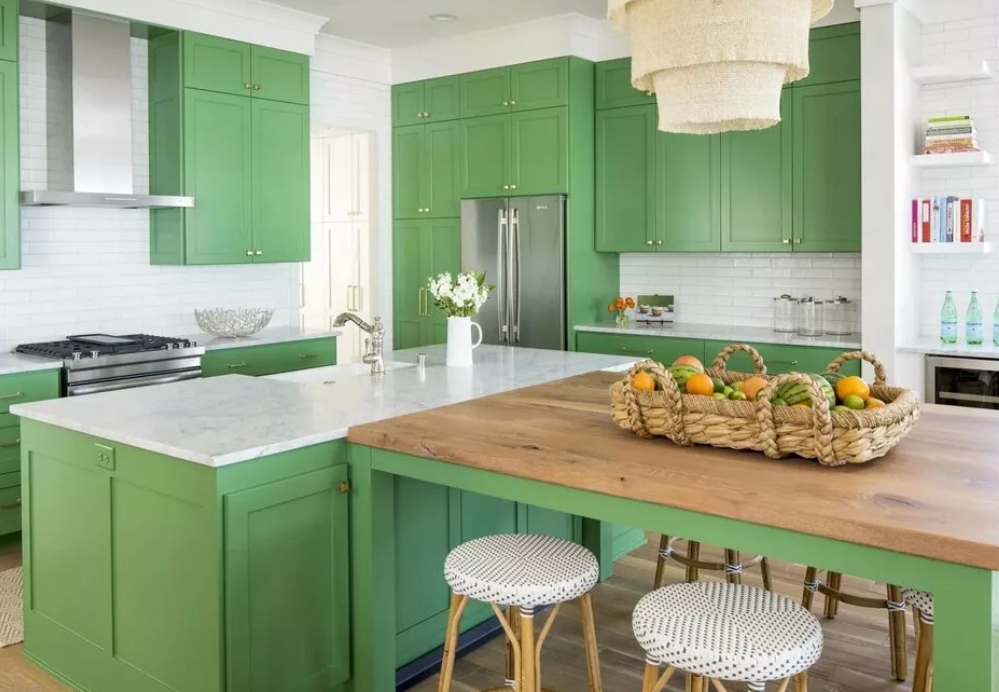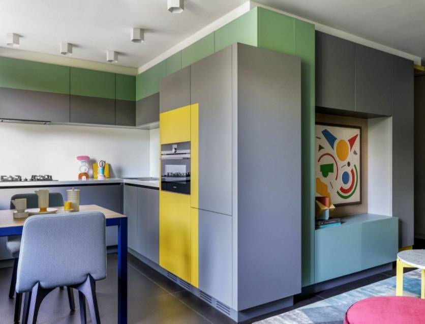Оливковый и бирюзовый можно неожиданно смешать с розовым. В таком интерьере будут уместны зеркальные поверхности и строго ультрамодная бытовая техника. Одним из самых популярных сочетаний является микс желто-зеленой с оттенками, к примеру,с оранжевым. Подобная кухня, несмотря на более темный низ и светлый верх, напоминает летние мотивы, поднимает настроение и дарит позитивную энергетику.