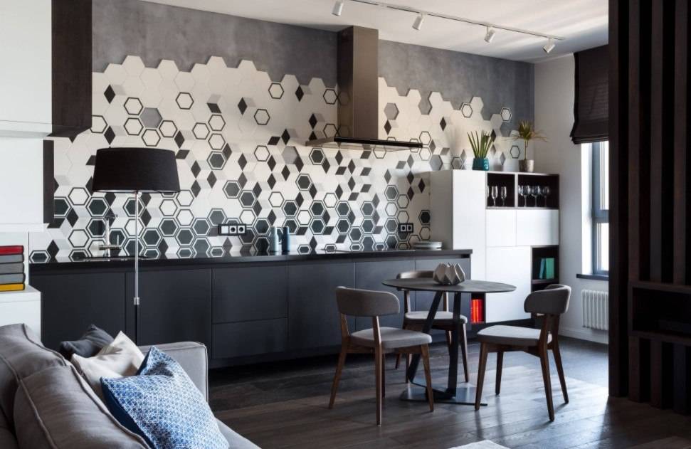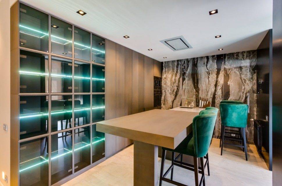 В интерьер включают точечные подсветки. Обеденную зону оформляют с помощью плитки с блеском металла.