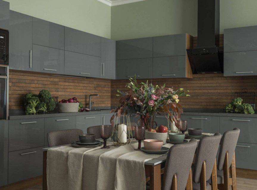 Если основным элементом выбирают скинали зеленой тональности, тогда остальные оттенки в обстановке кухни стоит приглушить, чтобы не потерялся эффект игривости в фартучной конструкции.