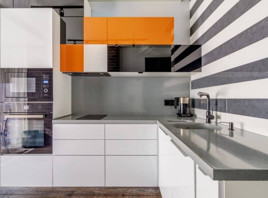 Черно-оранжевые кухни в последнее время стали все чаше использоваться для контрастных кухонь как для дорогой так и для бюджетной. Чтобы сделать небольшую разбавку строгих контуров, достаточно добавить серебристый, например, где-нибудь посередине. Уместны мелкие яркие рисунки и другие мелкие детали интерьера.