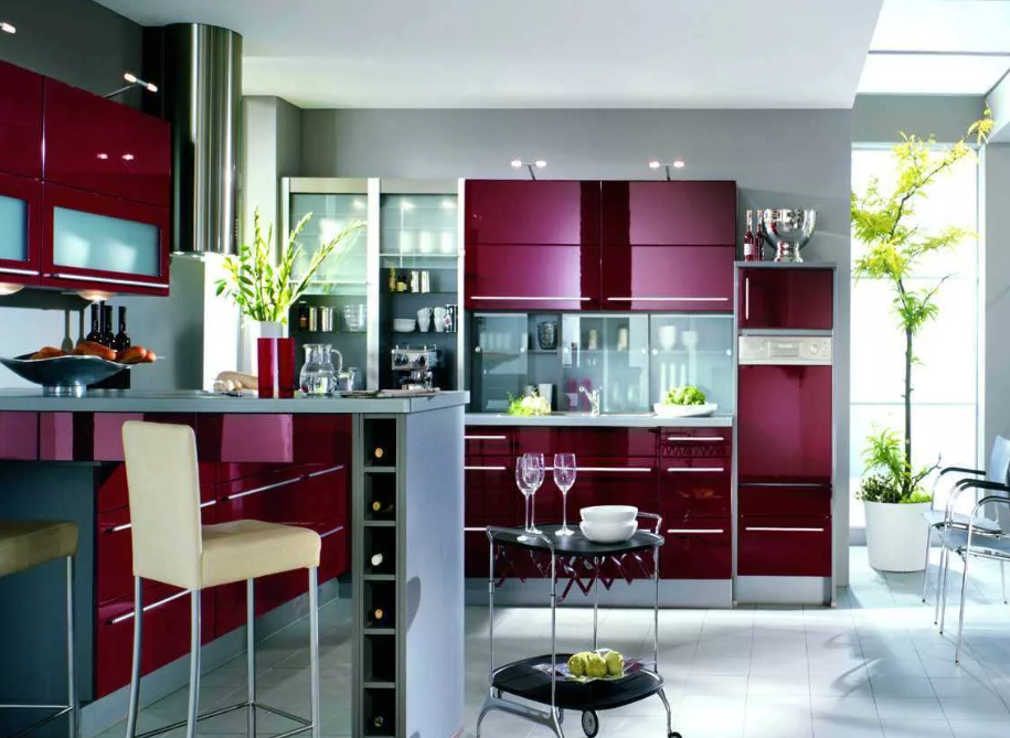 Белый и черный цвета могут выглядеть презентабельно, однако некоторые полагают, что они достаточно скучны. Альтернативным вариантом является замена черного на ярко-красный. Если поиграть с оттенками сочетания, можно выделить наиболее удачные для конкретного случая варианты, например, элементы красно-черной кухни. Некоторые предпочитают классический красный, а кто-то выберет его приглушенный оттенок. Если целью обновления интерьера является придание хорошего настроения на целый день, следует выбрать алый цвет, который будет доминировать. Белый призван оттенять и разбавлять его. Чтобы разнообразить интерьер, можно добавить яркие аксессуары, такие как зеленые яблоки на столе.