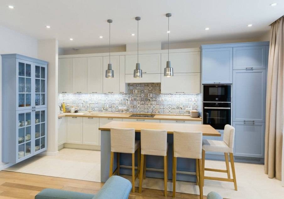 Мебель для помещений в светлых тонах выбирают с матовыми фасадами. Фартук в таком интерьере не должен выбиваться из общего стиля. Вместо плитки часто используют поверхности с эффектом кракелюр. Здесь уместны легкие потертости и искусственное состаривание фактурной плитки.