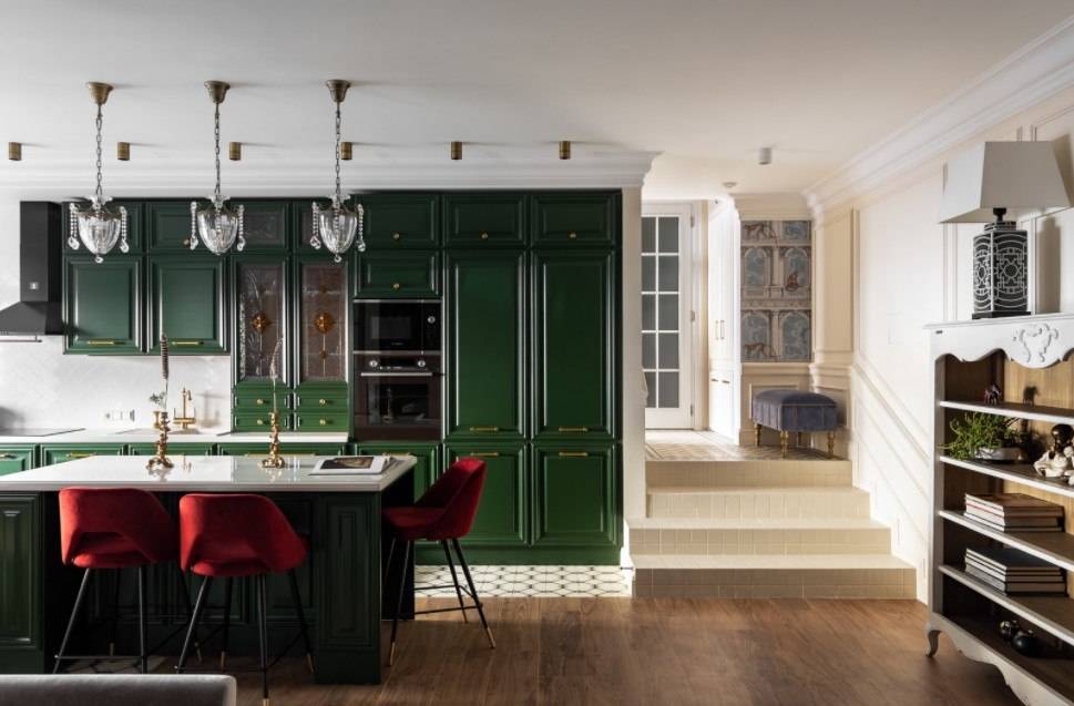 Гарнитур содержащий, изумрудную расцветку выглядит роскошно. В таком варианте рабочей зоны нужно придерживаться нейтрального тона, чтобы не получилось конфликтности палитры.