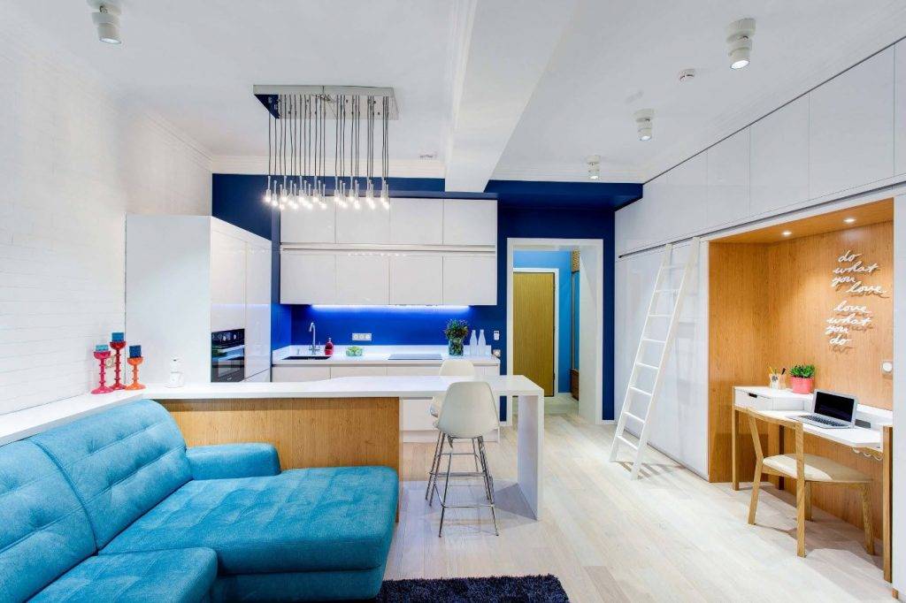Обычно голубой цвет ассоциируется с небом и морем, поэтому при удачном его использовании, вы получите интерьер, дарящий заряд бодрости и поднимающий настроение. Если ваша кухня имеет небольшую площадь, то такой цвет поможет визуально увеличить пространство.