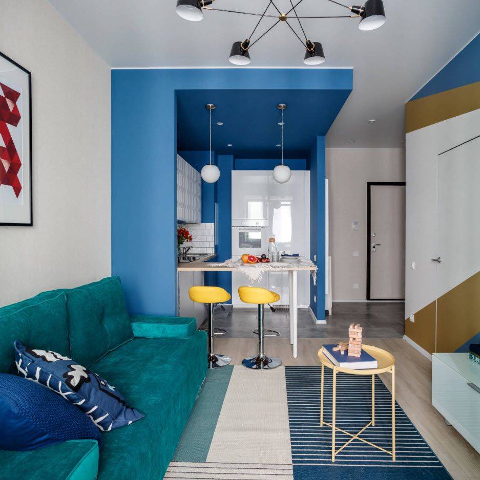 - Интересный приём — разноцветные стены. Он подходит для зонирования. Наполняет ощущением игривости, перепадов настроения.