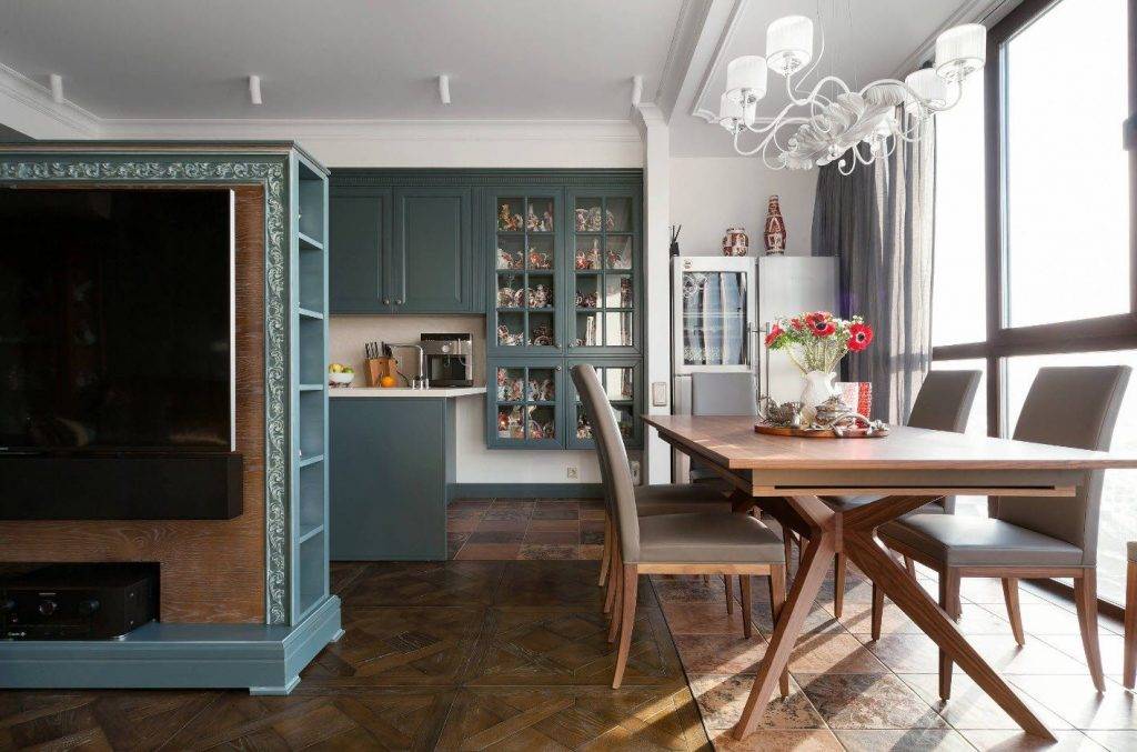 чаще всего кладут плитку, ламинат. Часто используемый приём — комбинация материалов. В рабочей зоне — плитка, в обеденной — ламинат, паркет, деревянный массив.