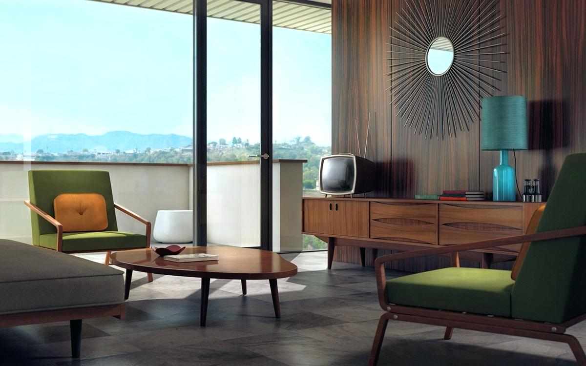 Одна комната совмещала в себе функции спальни, гостиной и столовой, мебель, соответственно, днем была диваном, ночью кроватью, шкаф или сервант выступал в роли разграничителя пространства. В интерьерах возникли гарнитуры, которые производились из дерева и фанеры, легкость им придавали высокие ножки, за стеклянными фасадами демонстрировались коллекции посуды из стекла и хрусталя. Популярны были раскладывающиеся столы, кухонная гарнитурная мебель. Кресла на деревянных каркасах имели несколько аскетичный вид, но по качеству не уступали зарубежным аналогам.