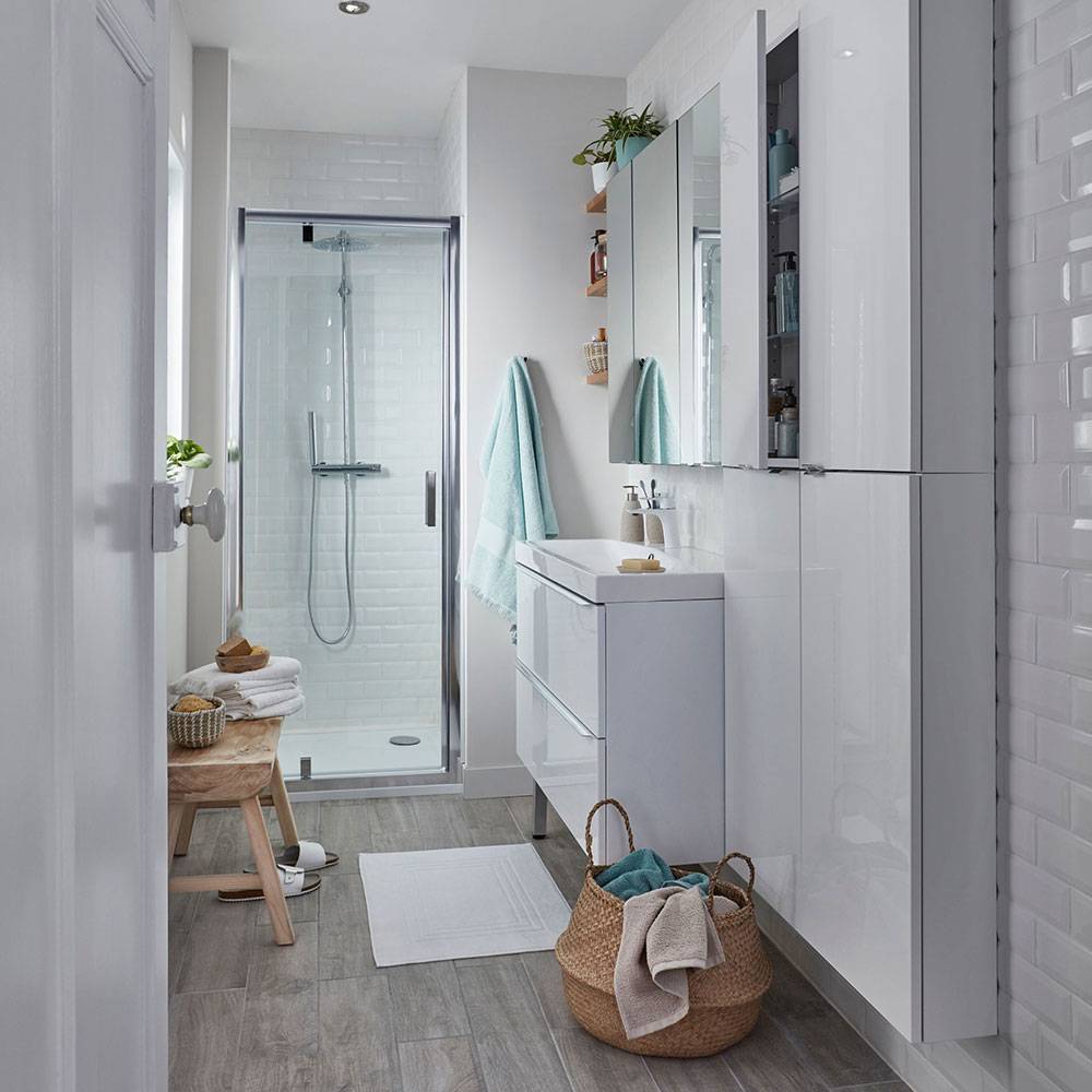 - Большее пространство, позволяет поставить больше шкафчиков для хранения банных принадлежностей, стиральную машину и больше мелочей, приносящих радость.