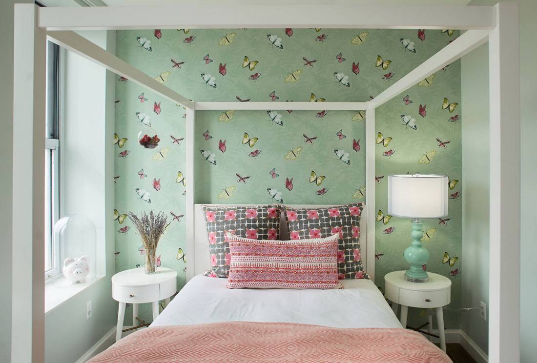 Обычно при помощи обоев с принтом, особенно если он довольно яркий и заметный, оформляют стену, у которой располагается изголовье кровати