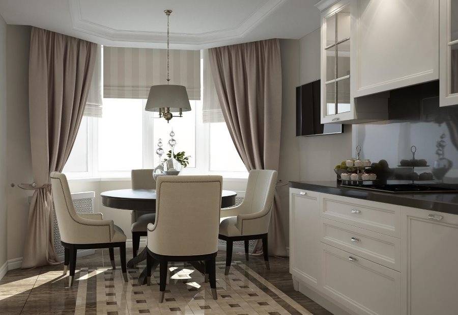 Шторы для эркерных окон надо выбирать с учетом формы эркера, так как окон несколько, помещение достаточно освещено — возможно, даже надо немного его затемнить. Часто, если есть на кухне эркерные окна, они используются как часть рабочего пространства с естественным освещением. В отличие от, например, гостиных, где уместно задрапировать такие окна тяжелыми портьерами с ламбрекенами.
