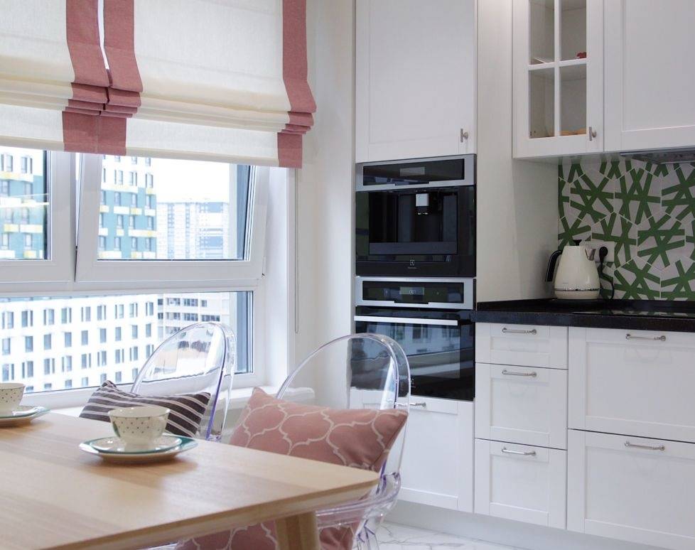 Поразить гостей и сделать кухню более функциональной помогут радиоуправляемые карнизы с электроприводом и необычные принты на шторах. Но помните: слишком крупный узор в маленьком помещении будет казаться неуместным.