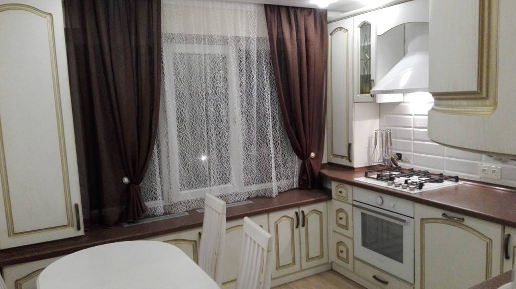 Занавеси могут быть на пару сантиметров выше или на 10-15 см ниже подоконника. Традиционный вариант – шторы до пола. На кухне уместны все варианты, главное, учесть особенности помещения и практичность.