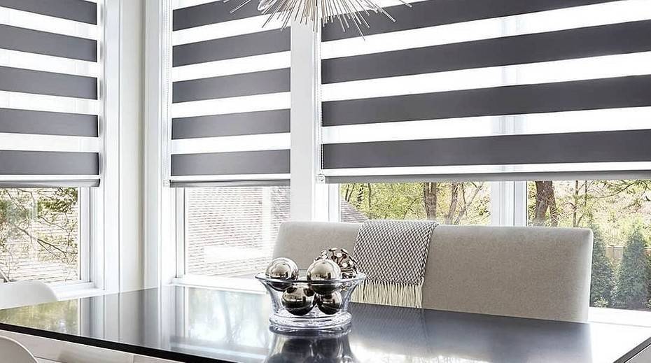 Для кухни могут использоваться разные типы штор в стиле минимализм. Самым удачным вариантом будет применение жалюзи. Материал полотна желательно выбирать такой, чтобы он содержал в себе пропитку из огнеупорного состава. В результате получается не только удобное и практичное, но и безопасное решение.