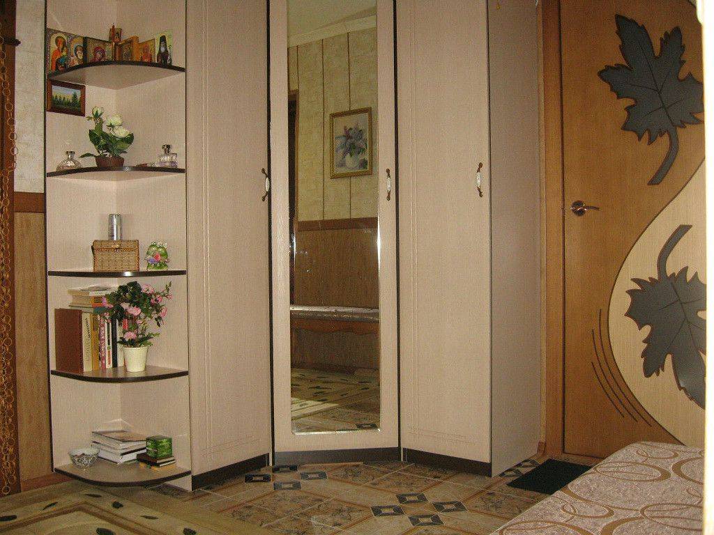 Еще один вариант шкафа-купе для небольшого коридора — угловая модель. Комплектуются такие шифоньеры радиусными створками, которые смотрятся необычно. Для экономии места можно купить тонкую модель г-образной формы.