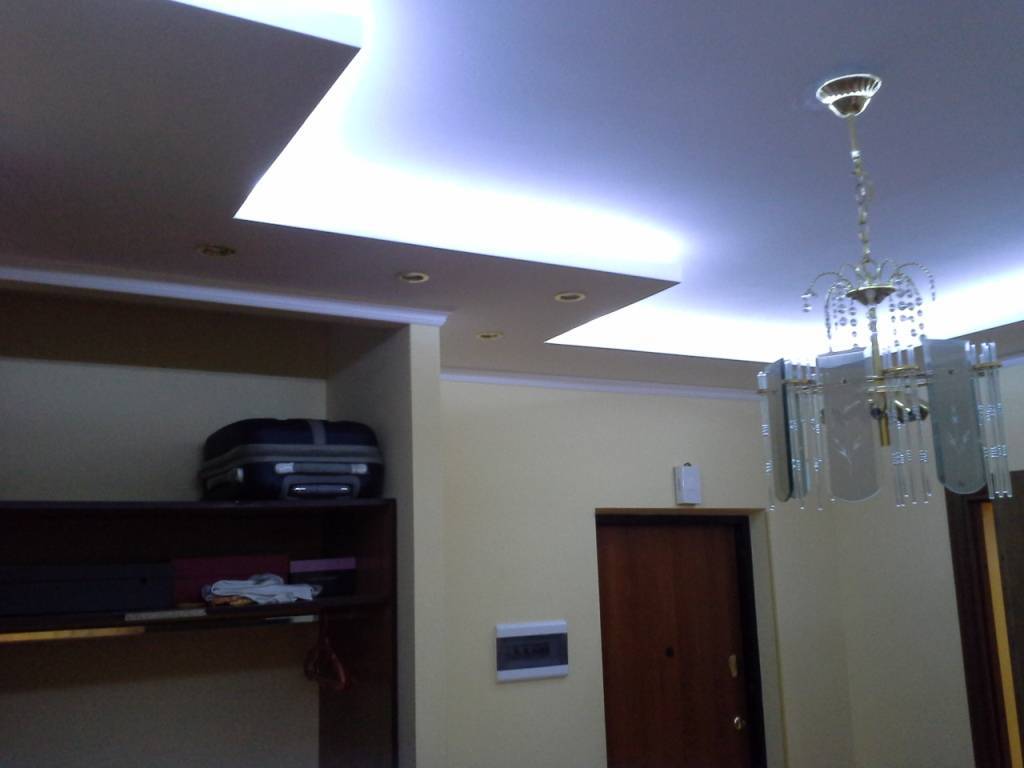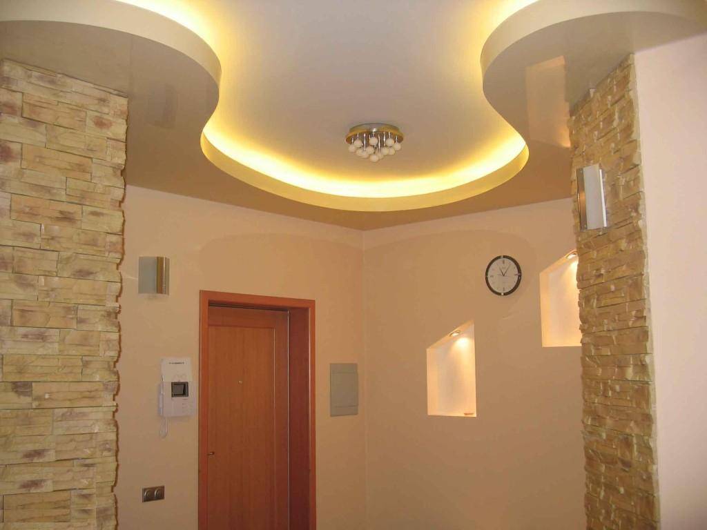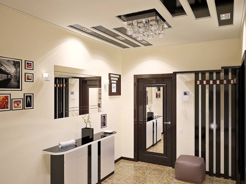 Также, что касается выбора между подвесным или натяжным потолком, зависит от того освещения, которое Вам хотелось бы сделать в прихожей. В случае предпочтения встроенных светильников – идеальный вариант подвесные потолки. Если Вы предпочитаете оформление подвесным освещением, таким как люстры или светильники, тогда выбирайте натяжные потолки.