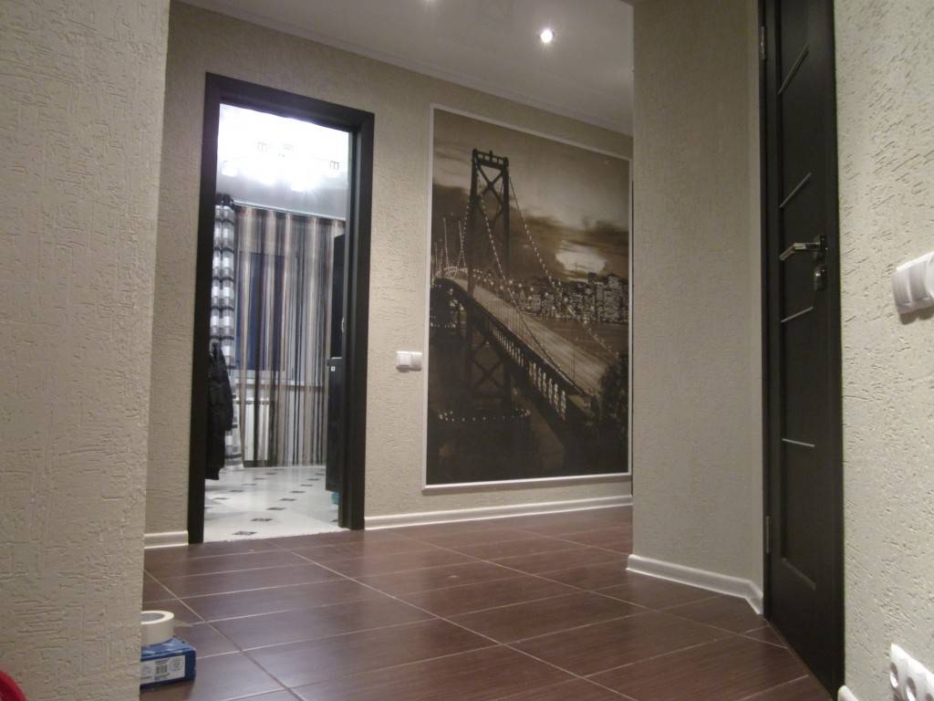 На фото натяжное полотно с фотопечатью в интерьере коридора.
