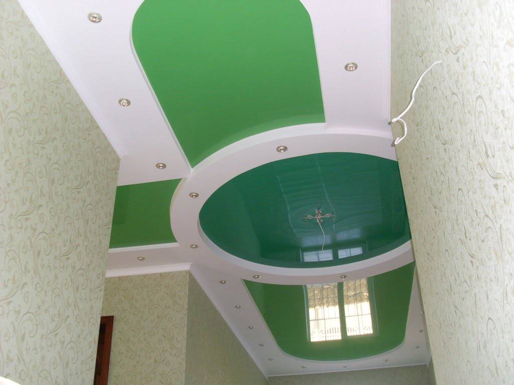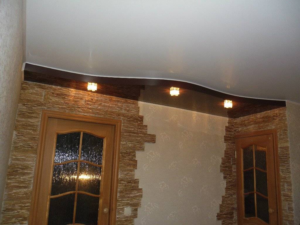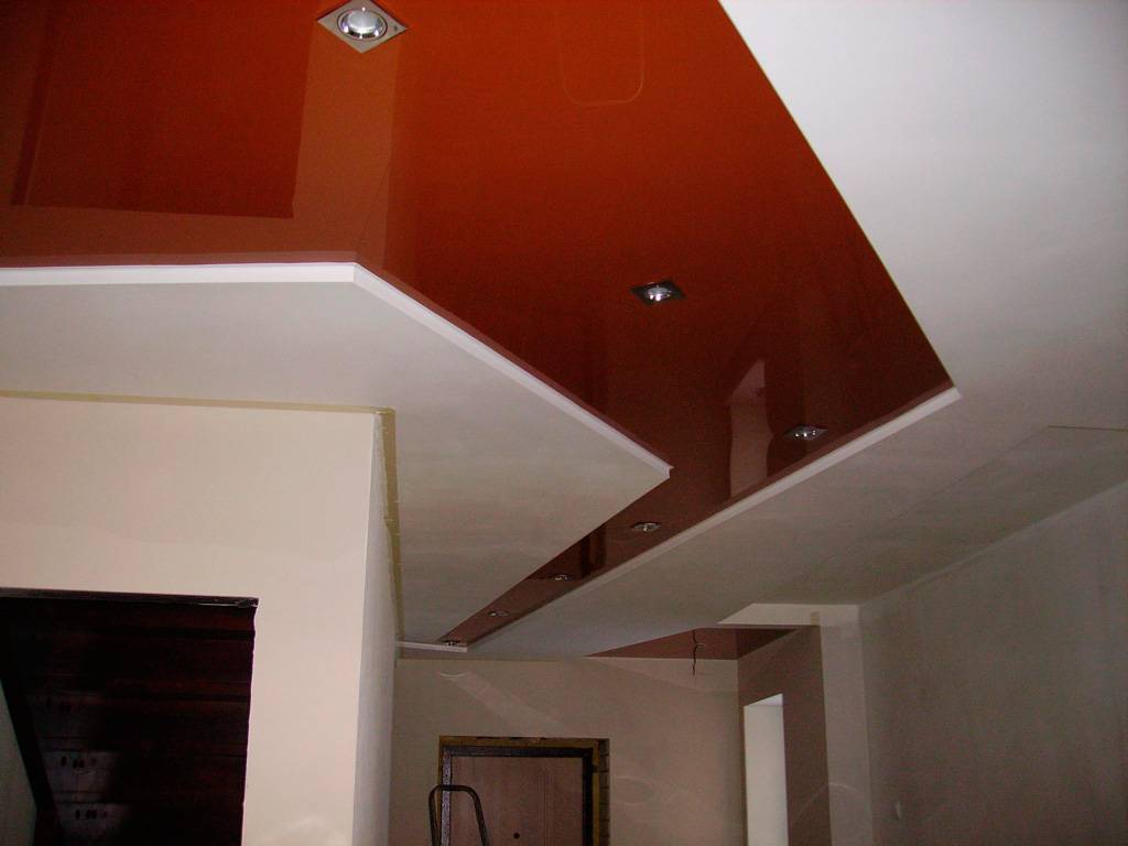 Натяжные конструкции в комбинации с гипсокартоном, довольно распространенное решение, что станет оптимальным вариантом для небольшой прихожей, которую нужно визуально увеличить в размерах.