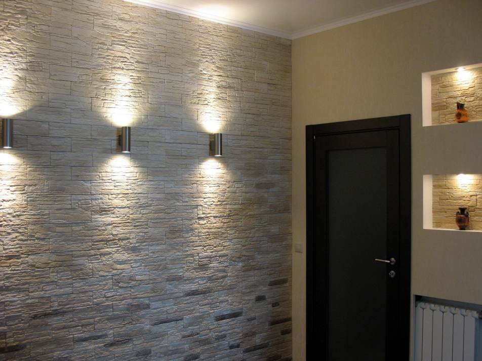 Широко применяется для декорирования любых типов поверхности. Благодаря гипсовой структуре материала легок в использовании и не противопоказан к оформлению даже тонких стен и перегородок. Площадь укладки декоративного камня зависит от стиля интерьера. Отделка проходов каменными элементами под цвет облицовки стен существенно оживит пространство в любом стиле, а к стилям кантри или рустик добавит необходимый акцент.