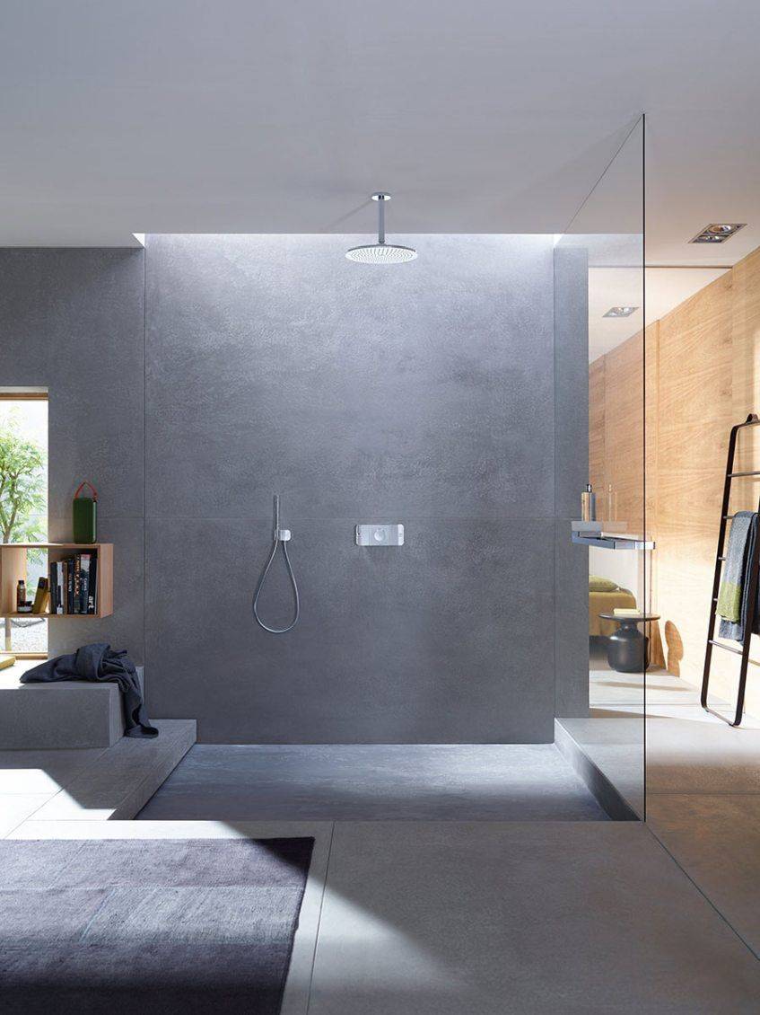 Стиль современной ванной комнаты регулируется принципом «меньше значит больше». Это не означает, что комната должна быть белой от пола до потолка. Данная особенность указывает только на то, что в помещении нет ничего, что непосредственно не наделено функциональностью. Четыре разноцветных полотенца и ряд косметики на виду — это не здесь. Современные ванные комнаты любят монохромные цвета. Помещения в серых и белых расцветках сегодня на пике популярности. Декор не поражает разнообразием и интенсивностью цветов. На климат ванной комнаты влияют интересные сочетания расцветок и материалов. Успокаивающий серый цвет плиток, часто имитирующих бетон, а также белый пол и керамику, которые идеально сочетаются с натуральными оттенками коричневых или бежевых деревянных деталей, прекрасно согревают декор современных комнат личной гигиены.
