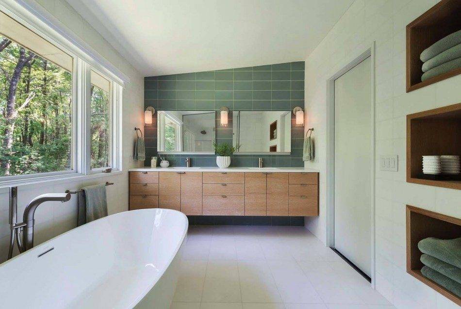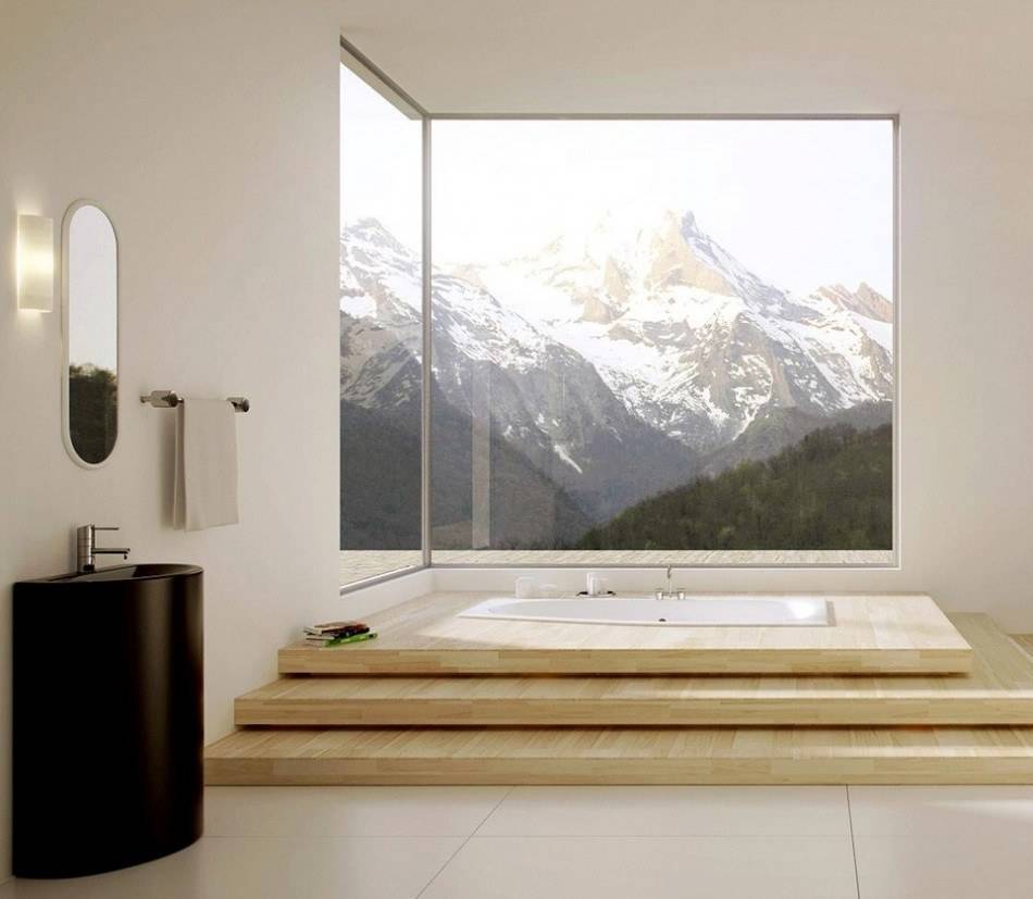 - Большое окно. В том случае, если оно отсутствует, его можно заменить большим зеркалом, расположив его напротив, что позволит улучшить освещение ванной.