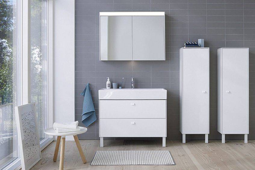 А для маленьких ванных комнат умывальник можно объединить с тумбой или установить над стиральной машинкой. Это абсолютно безопасно. Продаются даже готовые комплекты.